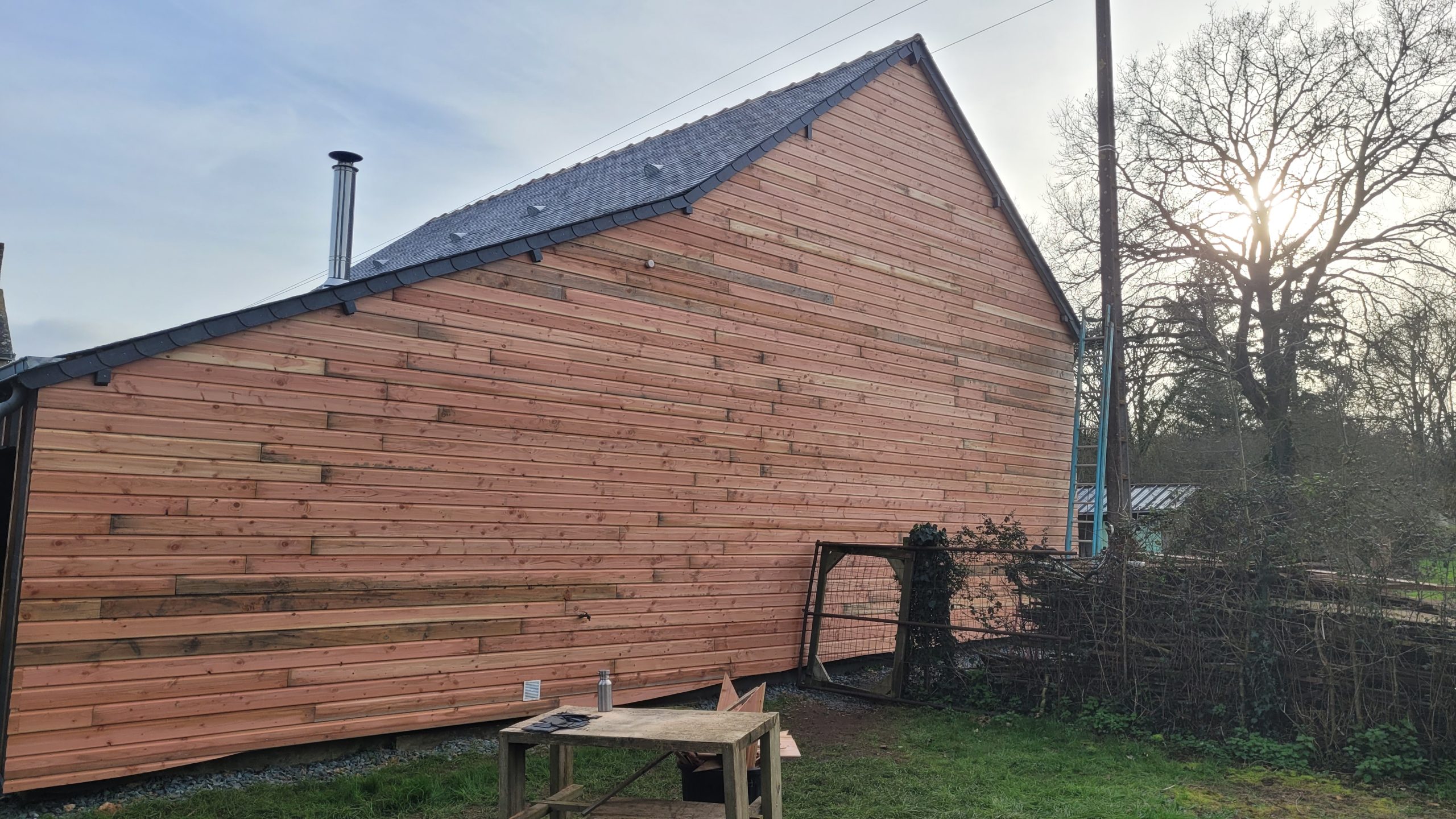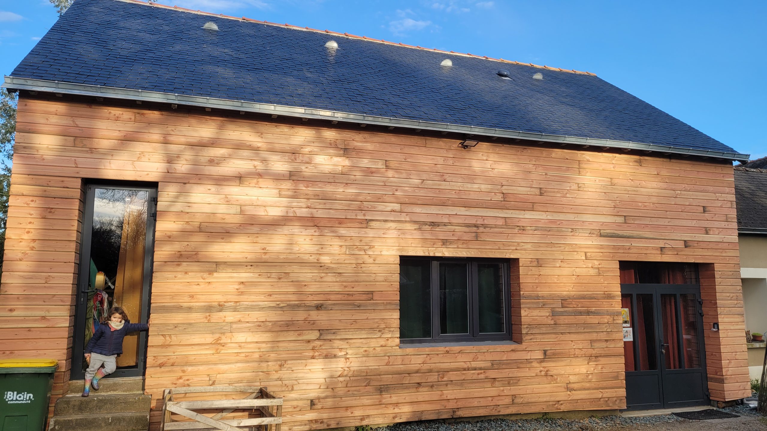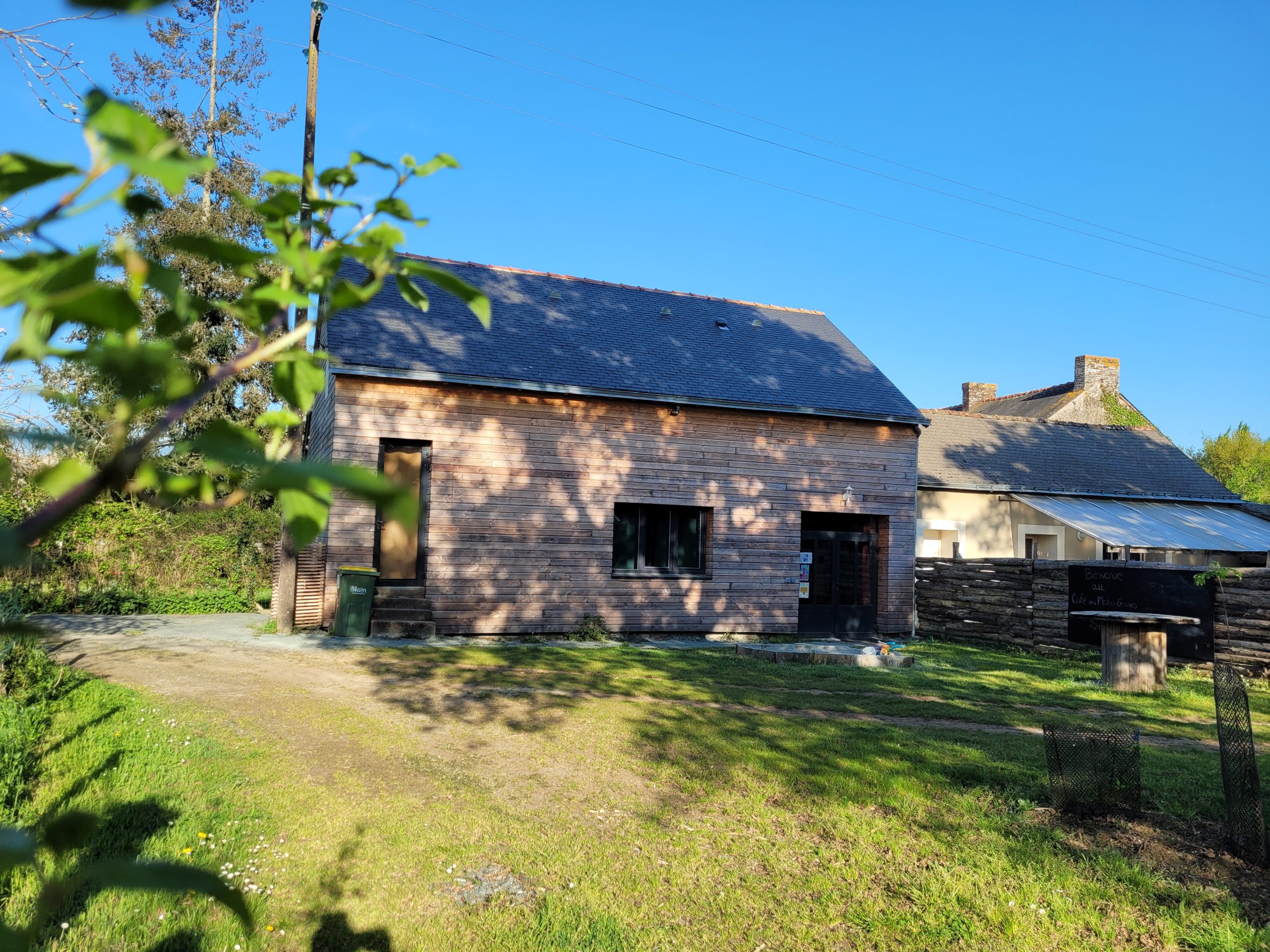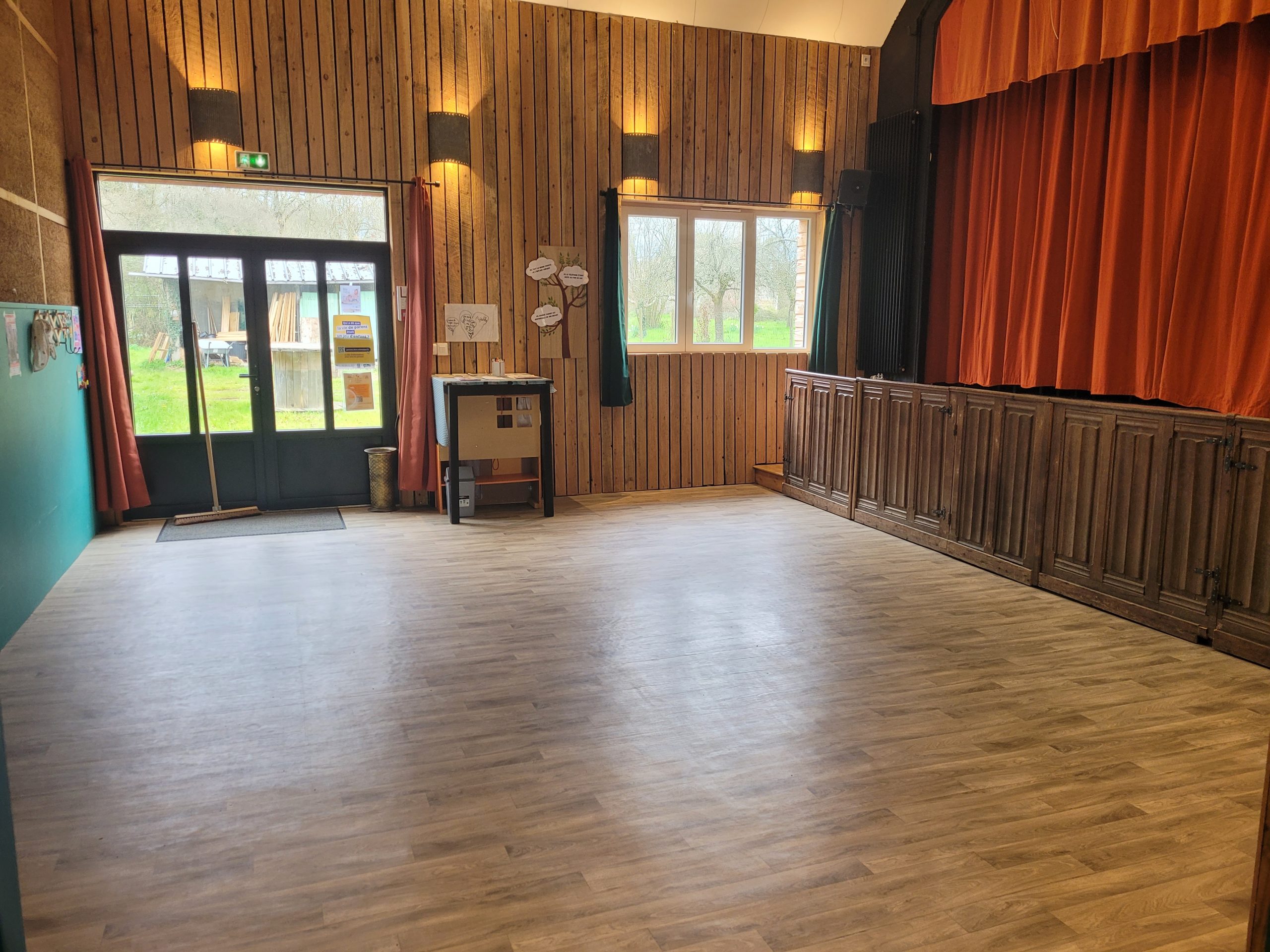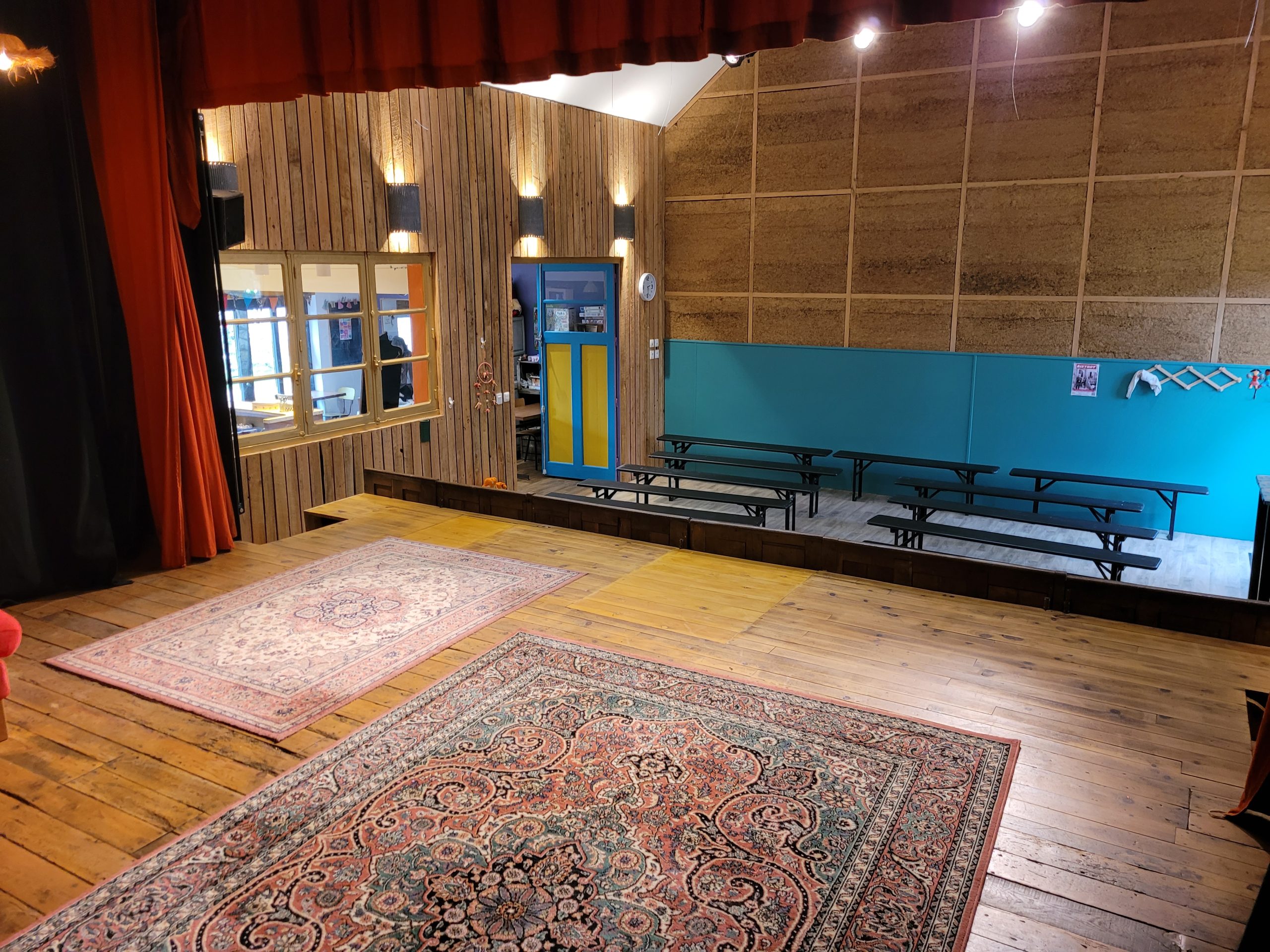 C’est en novembre 2022 qu’ont commencé les travaux de réfection. Il a fallu déposer un permis de chantier, faire tous les plans du lieu, les projections, isoler intégralement le bâtiment (combles, bardage, nouvelles fenêtres, système de chauffage…) et refaire la toiture en ardoise. Pour en faire un ERP (Etablissement Recevant du Public) nous avons du nous mettre aux norme d’accessibilités et de sécurité et donc : créer une extension pour faire des toilettes accessible personnes mobilité réduite, créer les issues de secours, mettre à niveau les planchers… Et aussi refaire tout le système électrique, les murs, les plafonds, la création d’espaces de rangements, mezzanine, création de la cuisine complète, restauration de la scène etc. etc. Nous avons travaillé dur et en avril 2024 nous avions enfin fini !