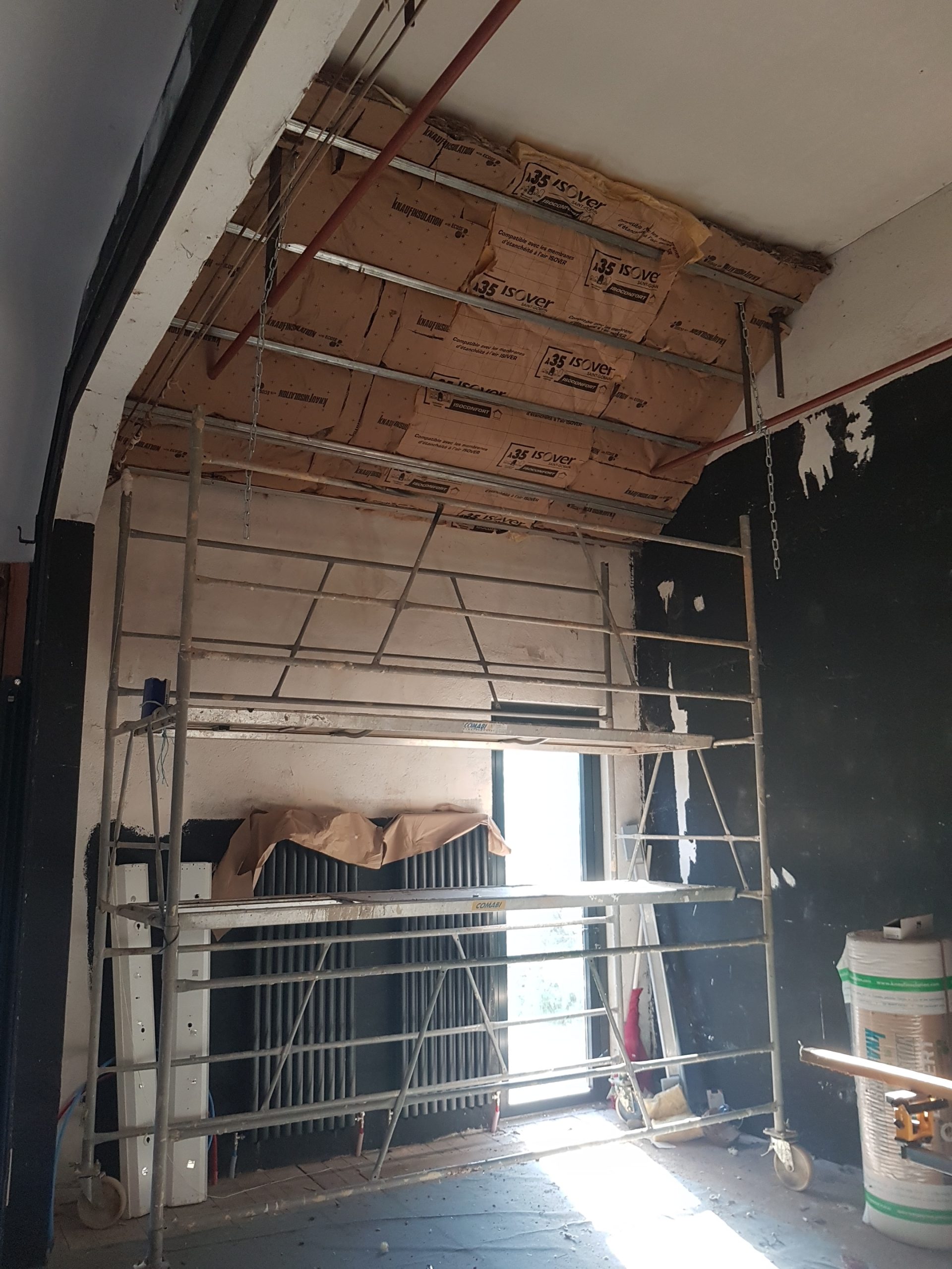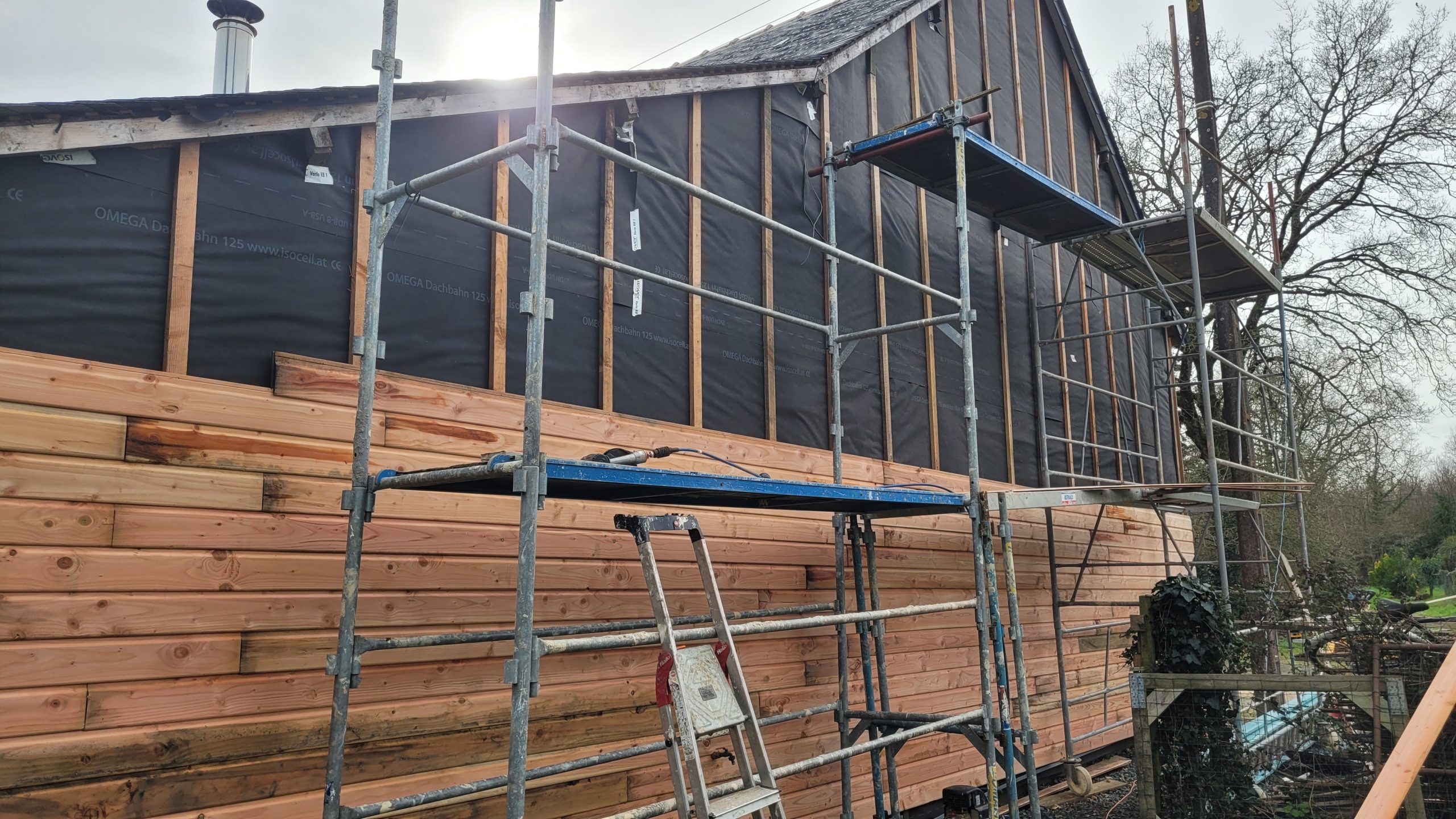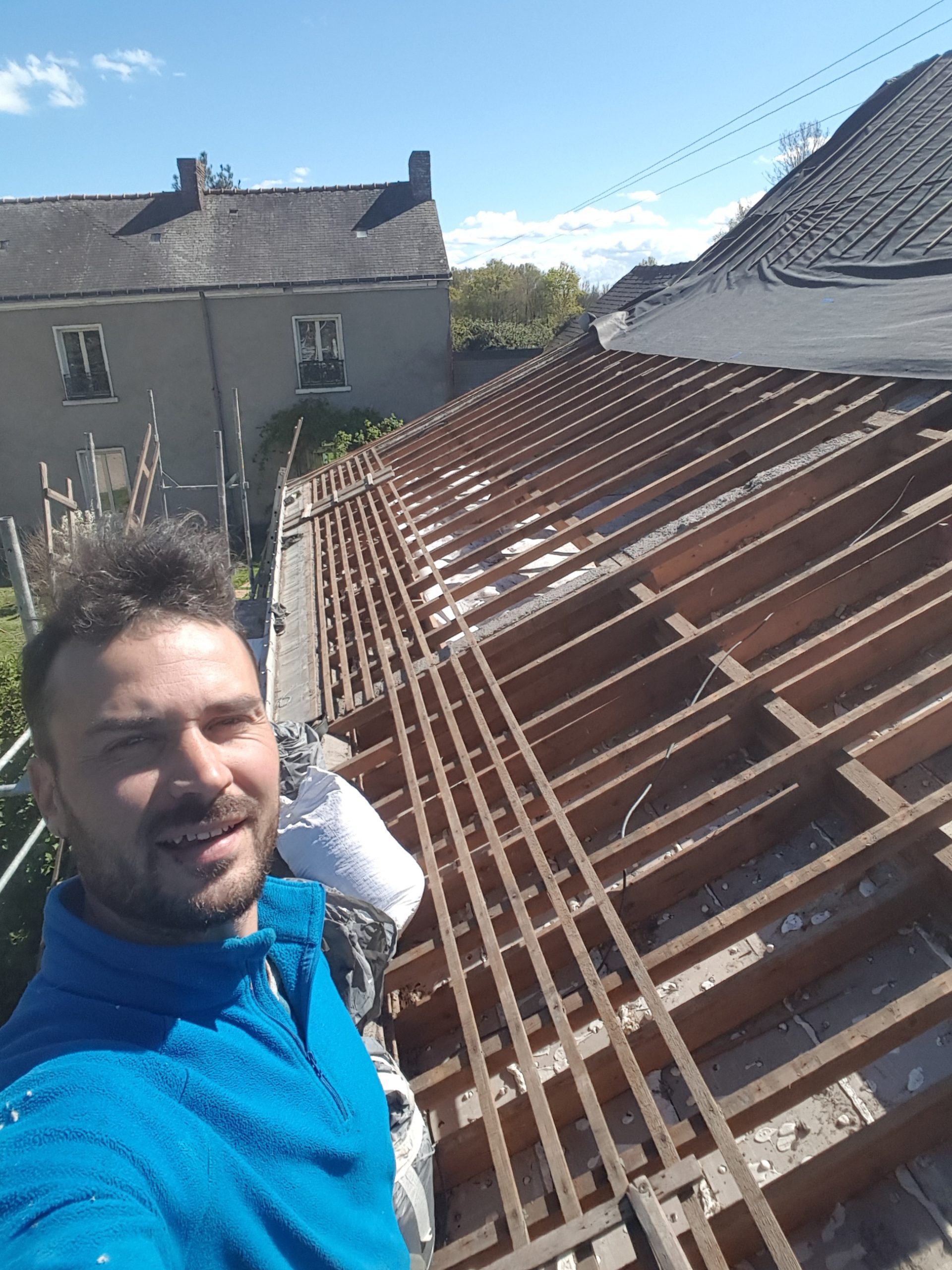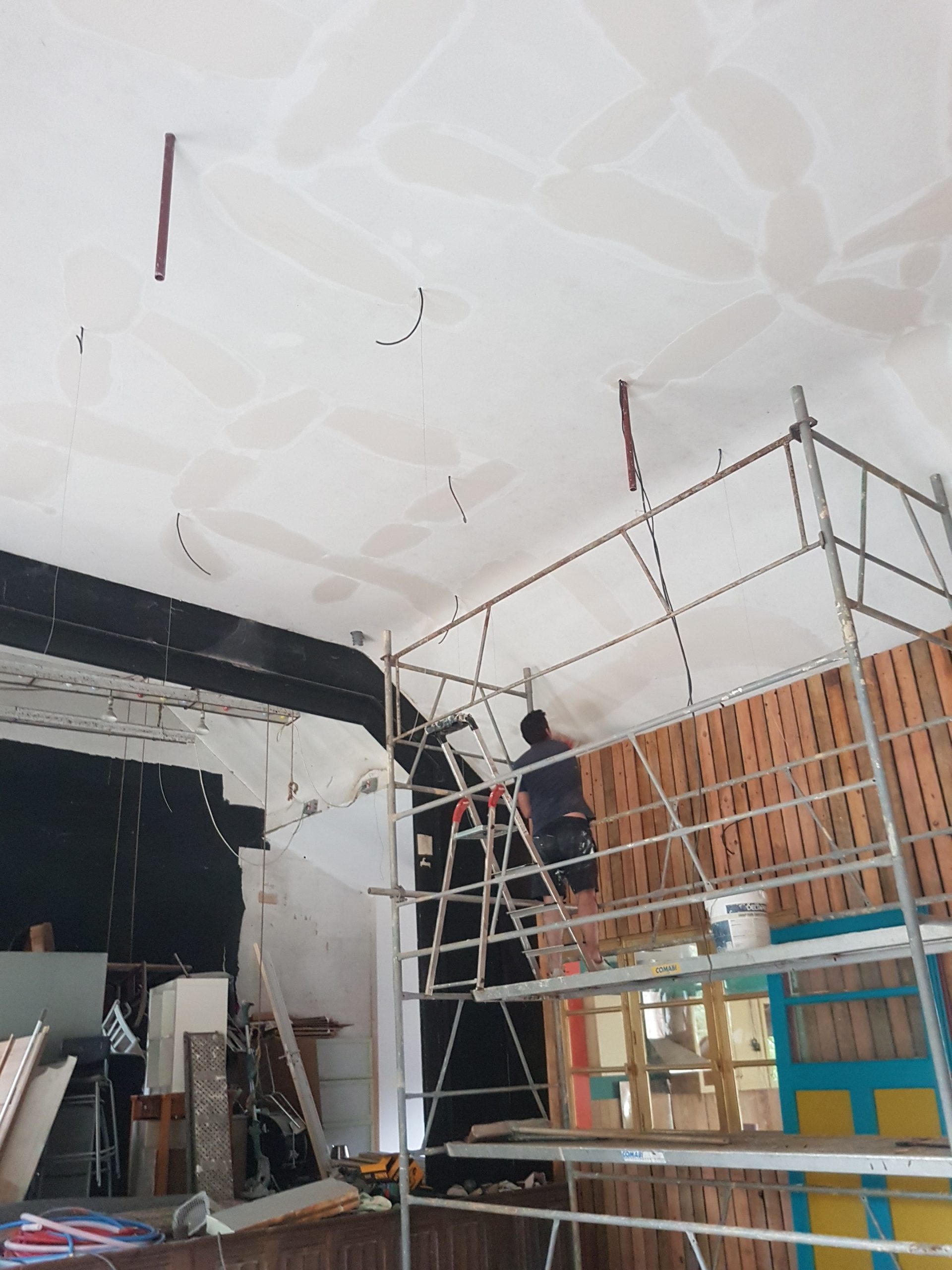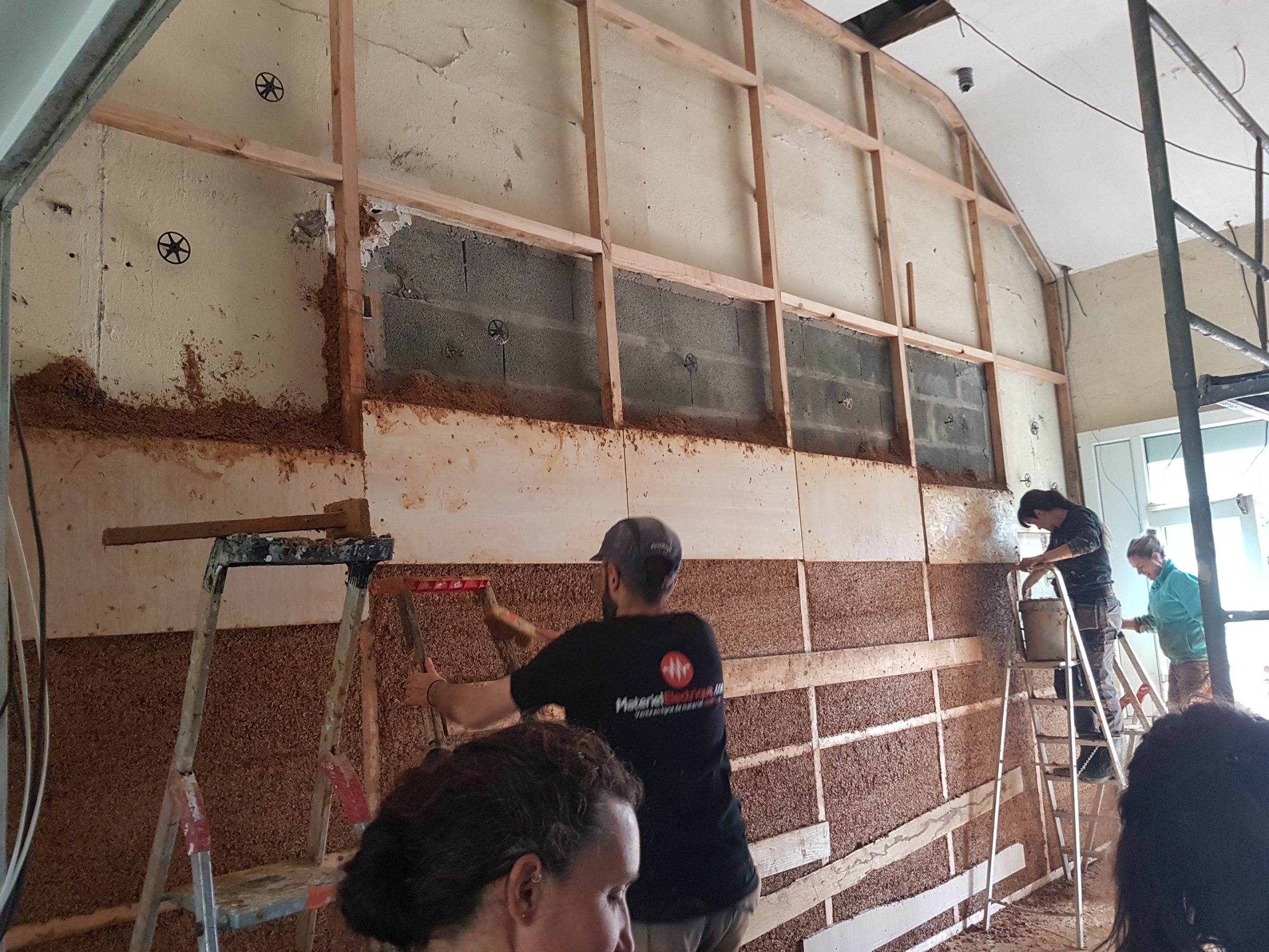 C’est en novembre 2022 qu’ont commencé les travaux de réfection. Il a fallu déposer un permis de chantier, faire tous les plans du lieu, les projections, isoler intégralement le bâtiment (combles, bardage, nouvelles fenêtres, système de chauffage…) et refaire la toiture en ardoise. Pour en faire un ERP (Etablissement Recevant du Public) nous avons du nous mettre aux norme d’accessibilités et de sécurité et donc : créer une extension pour faire des toilettes accessible personnes mobilité réduite, créer les issues de secours, mettre à niveau les planchers… Et aussi refaire tout le système électrique, les murs, les plafonds, la création d’espaces de rangements, mezzanine, création de la cuisine complète, restauration de la scène etc. etc. Nous avons travaillé dur et en avril 2024 nous avions enfin fini !