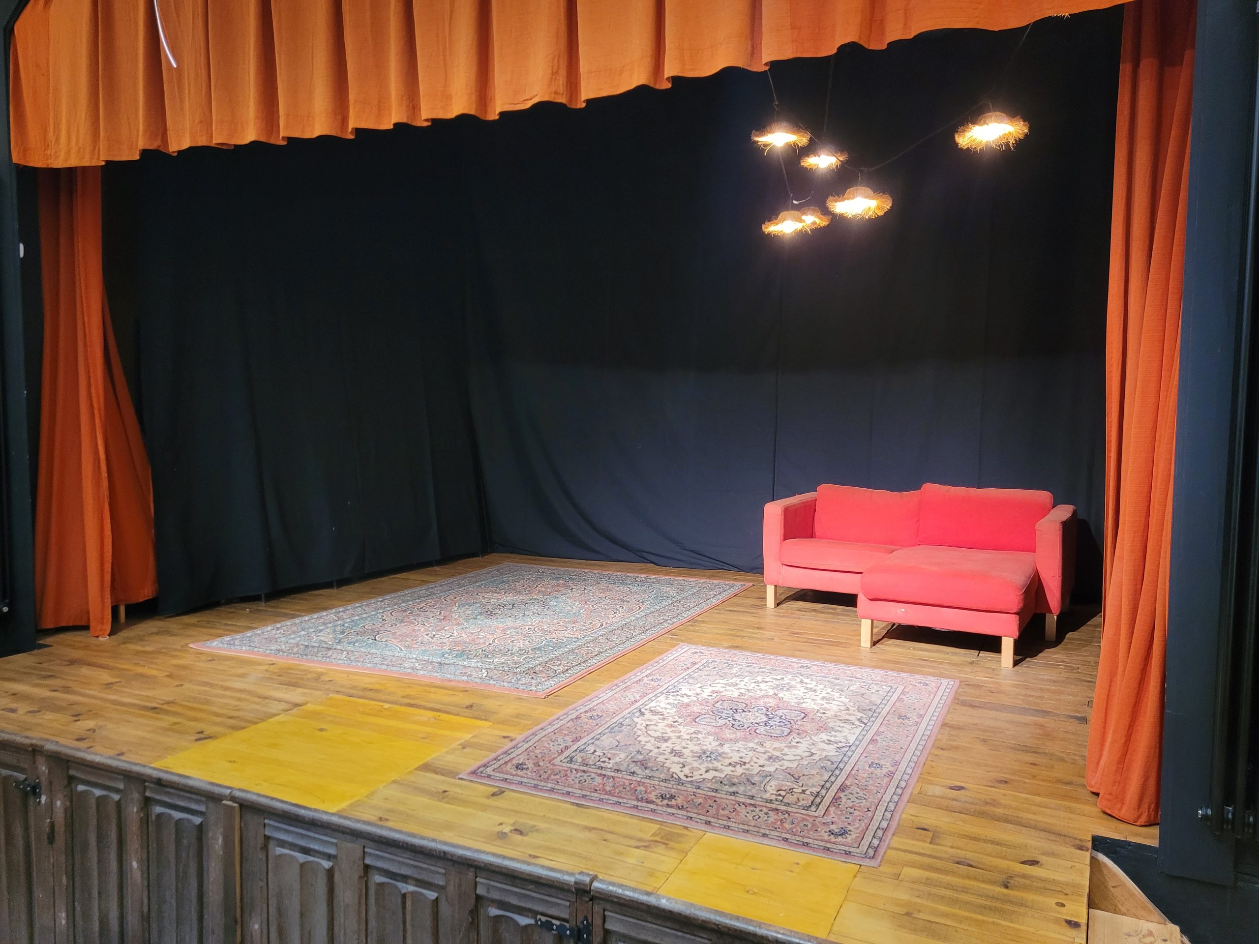 Une salle de spectacle avec 2 niveaux (scène et espace public) de 34m² chacun (6,6m d’ouverture x 5,2m de profondeur) avec 4,8m de hauteur sous plafond.